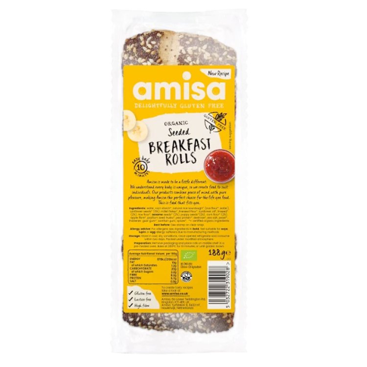 Amisa Organic Seeded Breakfast Rolls. Brown. Start your day the right way with these organic, naturally gluten-free seeded breakfast rolls. Packed with a tasty mix of sunflower seeds, linseeds, and sesame seeds, they add extra crunch, texture, and nutrition to your morning. Simply crisp them up in the oven for 10 minutes and enjoy with fresh fruit, jam, or your favourite breakfast fillings.