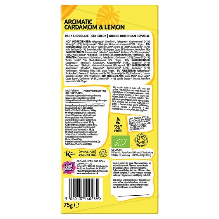 Bright lemon zest meets the warm spice of cardamom in this 58% dark chocolate bar. Smooth, citrusy and aromatic, it is a flavour combination that feels both exotic and uplifting. Crafted with organic and fairly traded ingredients and wrapped in fully compostable packaging, it is indulgence made with care for both people and planet. A bar that brings sunshine and spice to every bite.