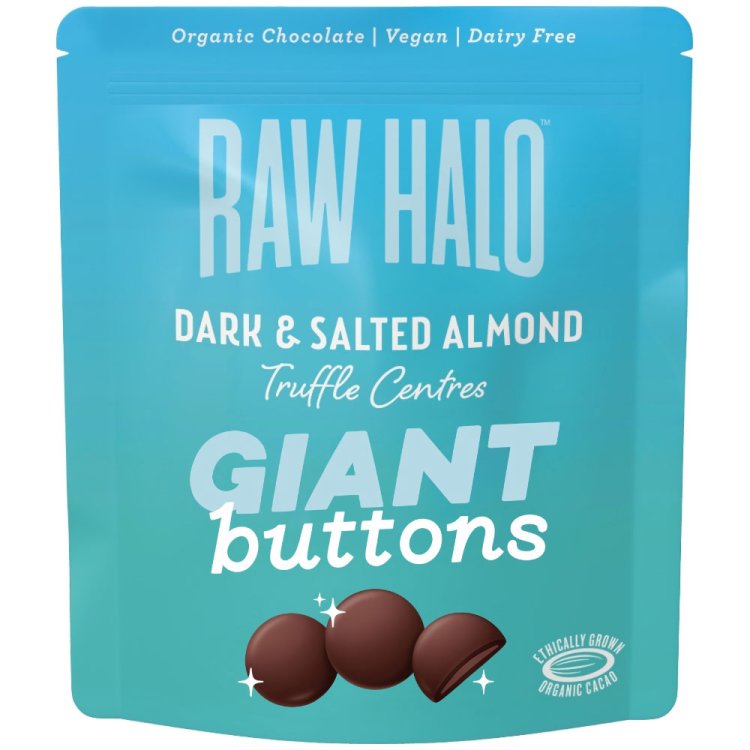 Organic Dark & Salted Giant Buttons by Raw Halo Indulge in the rich, velvety goodness of Raw Halo's Organic Dark & Salted Giant Buttons. These mouth-watering treats are crafted with premium organic cacao and sweetened gently with coconut sugar, offering the perfect balance of deep, dark chocolate flavour. Inside, you'll find a smooth and luxurious salted almond truffle centre that adds an irresistible twist to every bite. Whether you're unwinding after a long day or treating yourself to something special, these organic chocolate buttons are a deliciously satisfying way to indulge, with a touch of sea salt bringing the flavours to life. Pure, organic indulgence – big on flavour, big on satisfaction.