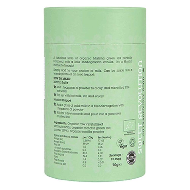 Take a mindful pause with Sweet Revolution’s Organic Matcha Latte, a creamy coffee alternative enriched with Madagascan vanilla. Made with the finest Japanese matcha, this barista blend is packed with antioxidants including L-theanine, chlorophyll and catechins, as well as vitamins A and C. Matcha is renowned for its calming yet energising properties, offering slow-release caffeine for focus and clarity, and has long been prized in Japan for its unique flavour and wellness benefits. Unlike traditional teas, matcha uses the whole powdered leaf, delivering far more antioxidants in every sip. Our latte mix combines vibrant organic matcha with unrefined coconut nectar and natural vanilla for a smooth, delicately sweet taste. Enjoy it hot with your favourite milk or pour it over cold milk for a refreshing frappe. Perfect as a nourishing daily ritual and a delicious alternative to coffee.