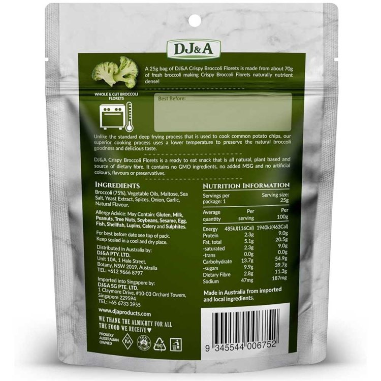 DJ&A’s Crispy Broccoli Florets are the perfect choice. Made with 75% broccoli, these florets are lightly seasoned and fried to perfection, giving you a satisfying crunch with every bite. These all-natural, plant-based crisps are a healthier alternative to traditional snacks. Free from GMOs, MSG, and artificial additives, they’re a guilt-free snack you can enjoy anytime. Whether you’re craving something tasty on-the-go or looking to add a crunchy touch to your meals, DJ&A’s Crispy Broccoli Florets have got you covered.