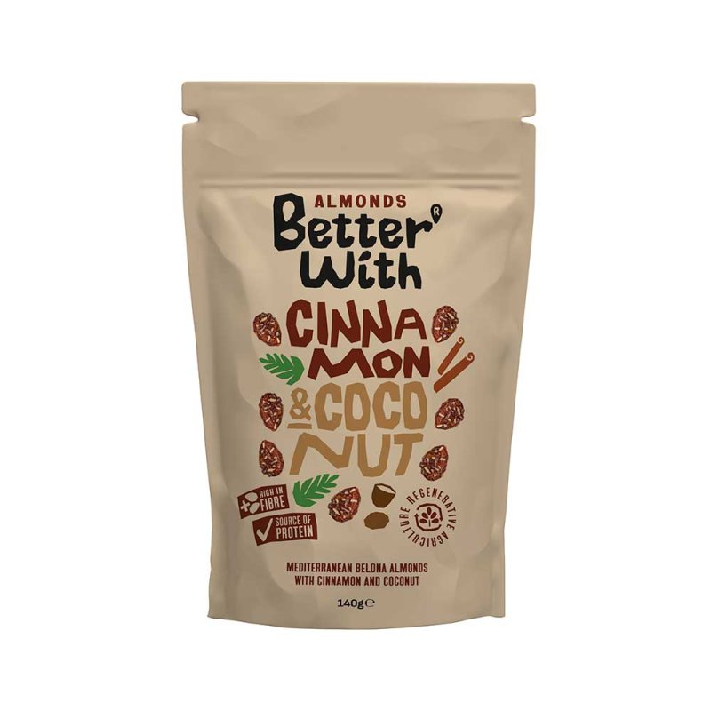 Better With Cinnamon & Coconut Almonds are slow-roasted for crunch, then dusted with warming cinnamon and a touch of coconut for a flavour that’s both cosy and exotic. It’s the perfect balance of nutty, sweet, and spiced, made for mindful snacking or a treat on the go. Premium regenerative Mediterranean almonds from Portugal.