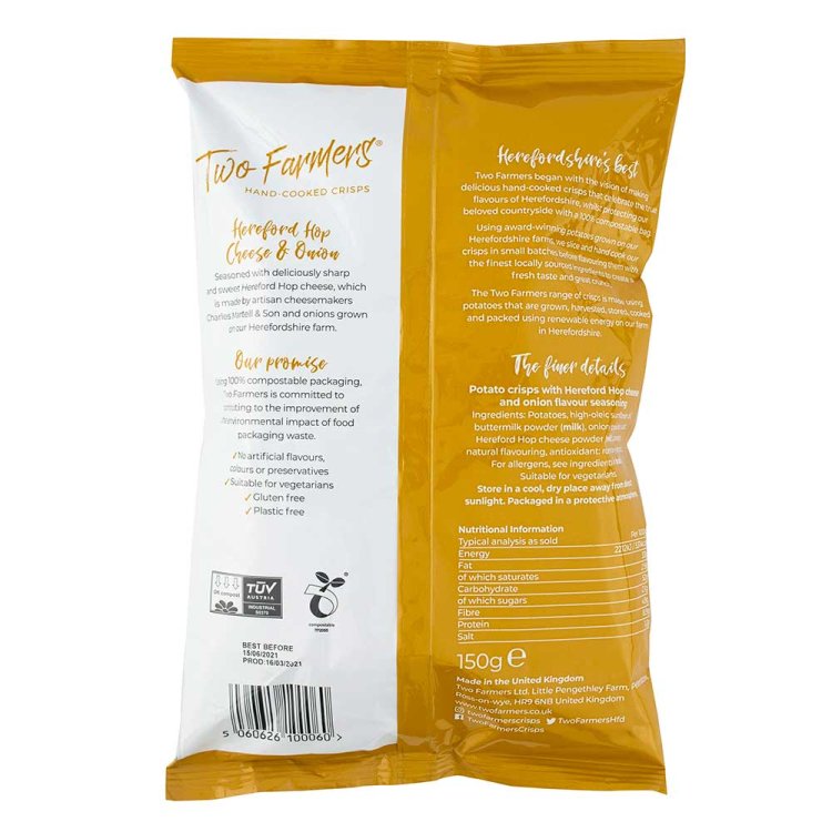 Made with high-quality ingredients sourced directly from Herefordshire, these crisps are crafted to give you the very best taste and crunch. Made with Hereford Hop cheese from artisan cheesemakers Charles Martell & Sons and onions grown on Two Farmers' own farm, these crisps are sliced and cooked in small batches to ensure a superior crunch with every bite. The eco-friendly, 100% compostable packaging supports sustainable practices, while the crisps themselves are suitable for both vegetarians and gluten-free diets. Treat yourself to a taste of Herefordshire with Two Farmers Hereford Hop Cheese & Onion Crisps!
