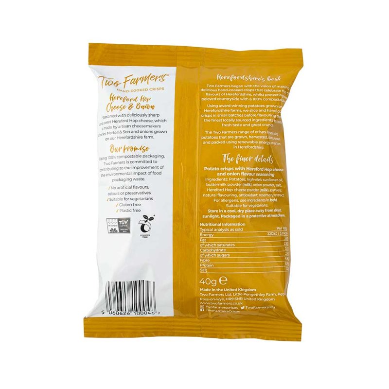Made with high-quality ingredients sourced directly from Herefordshire, these crisps are crafted to give you the very best taste and crunch. Made with Hereford Hop cheese from artisan cheesemakers Charles Martell & Sons and onions grown on Two Farmers' own farm, these crisps are sliced and cooked in small batches to ensure a superior crunch with every bite. The eco-friendly, 100% compostable packaging supports sustainable practices, while the crisps themselves are suitable for both vegetarians and gluten-free diets. Treat yourself to a taste of Herefordshire with Two Farmers Hereford Hop Cheese & Onion Crisps!
