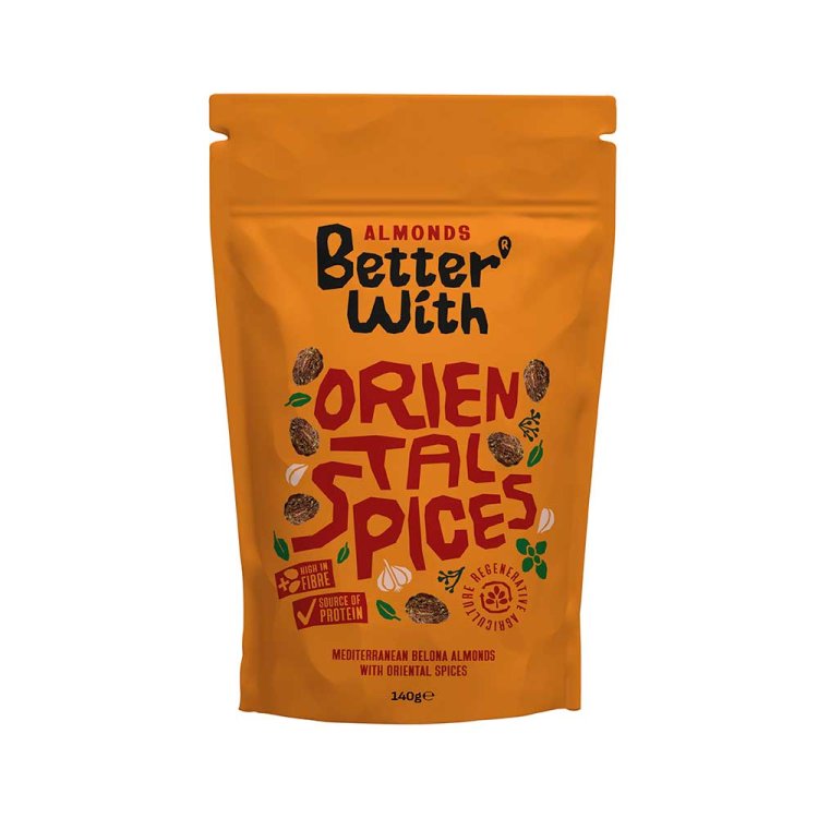 Better With Oriental Spices Almonds are roasted to perfection and coated in a bold, aromatic blend of spices. Think cumin, oregano, turmeric, and a hint of chilli bringing heat, depth and a world of flavour to every bite.