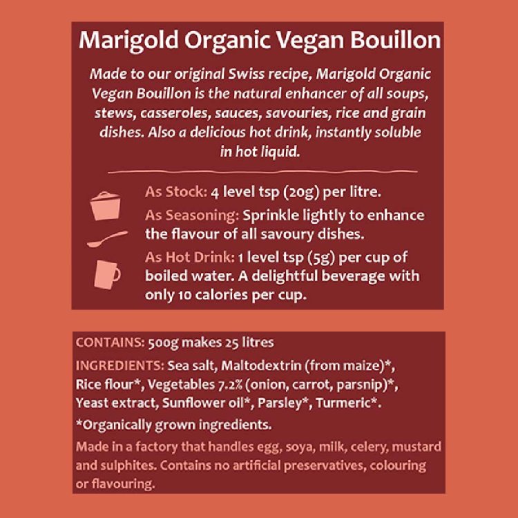 Made to the original Swiss recipe, this organic vegan bouillon adds rich flavour to almost any savoury dish. Instantly prepared, it can be stirred into soups, sauces, casseroles or enjoyed as a hot drink with only 12 calories per cup. Flavoursome and versatile, it is gluten free, palm oil free and yeast free. Made with 7% organic vegetables including onion, parsnip, carrot and leek, plus celery seed, herbs and spices, it brings depth and warmth to everyday cooking. Free from artificial colours, flavours, preservatives and GMOs.