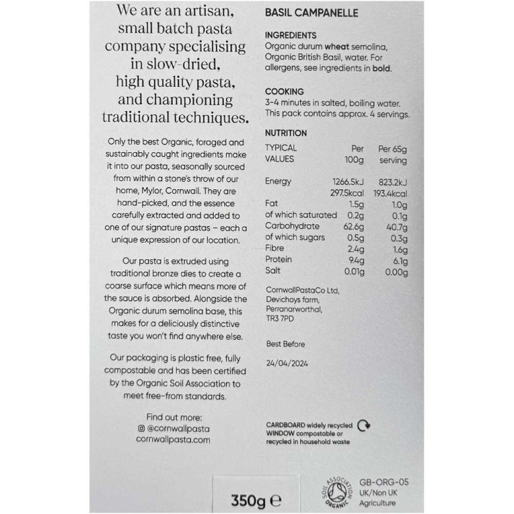 Organic Basil Campanelle - Liliflower shape Cornwall Pasta C