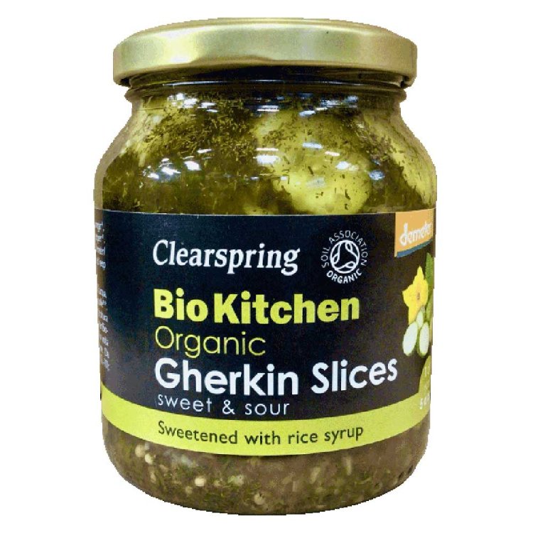 Demeter Organic sweet & sour gherkin slices, sweetened with rice syrup.