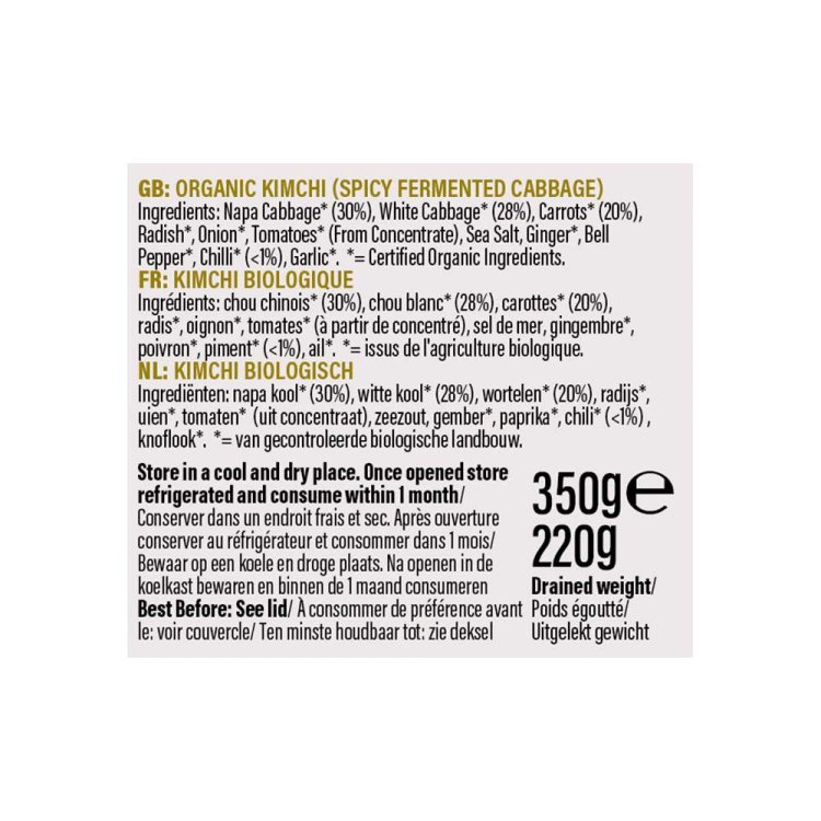 Nappa Cabbage* (74%), Horseradish*, (8%), Onion* (8%), Carrots* (6%), Sea Salt, Ginger*, Garlic*, Cayenne Pepper* (0.25%), Chilli Powder* (0.2%), Paprika Powder* (0.2%), *= Certified Organic Ingredients.