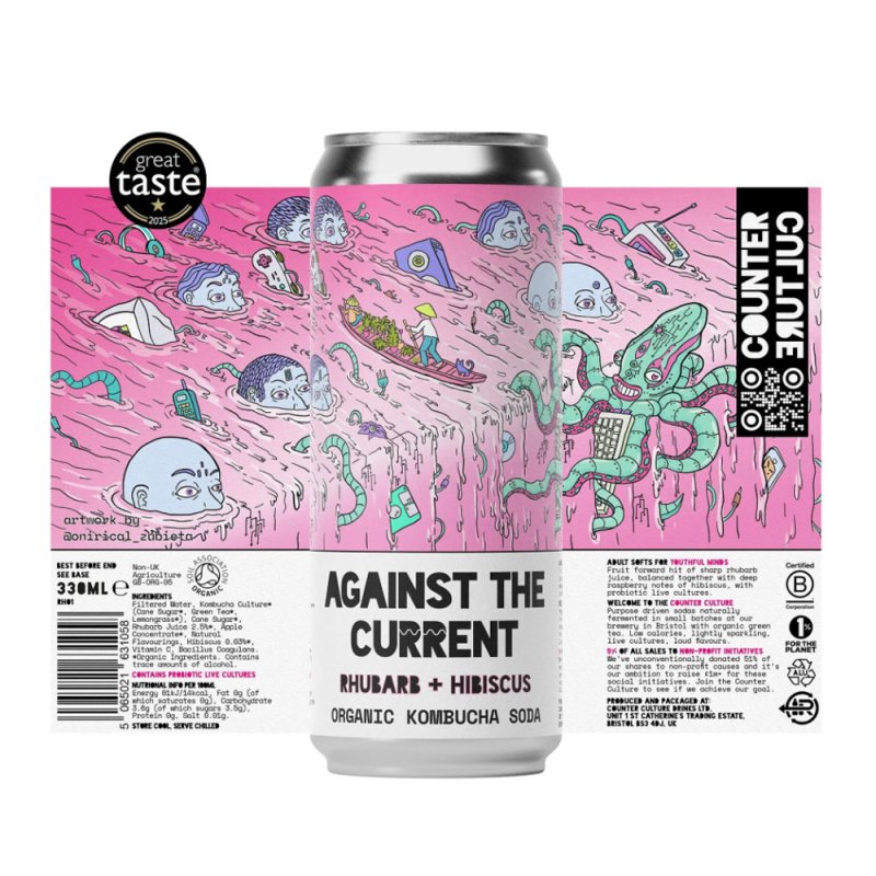 Sparkling light kombucha drink with a fruit forward hit of sharp rhubarb, balanced with deep raspberry notes of hibiscus. Best served over ice sat on a tartan blanket in a summer meadow. Consciously balanced to be lighter in acidity than a typical booch, Counter culture kombucha drinks are brewed in Bristol with organic green tea and organic raw cane sugar.