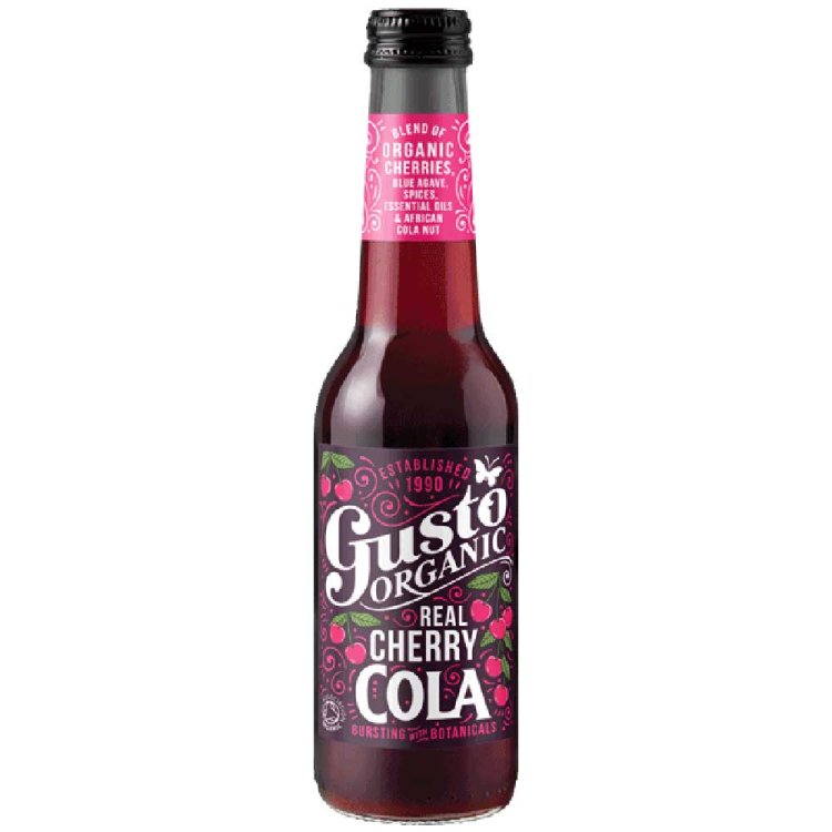 Gusto Organic Real Cherry Cola, a wonderful sharp, sweet blast of organic cherry juice perfectly balanced with organic and Fairtrade Madagascan vanilla.