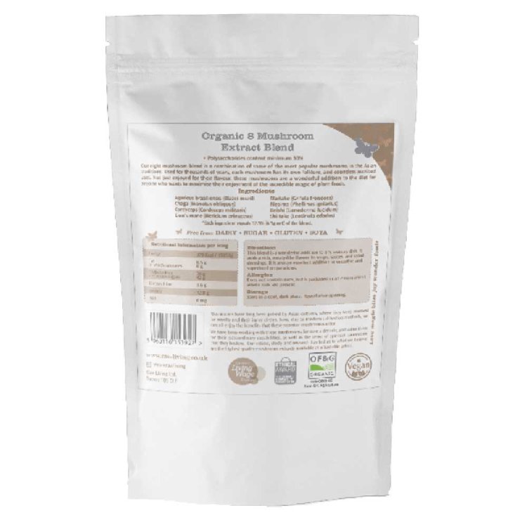 Eight mushroom blend is a combination of some of the most popular mushrooms in the Asian traditions. Used for thousands of years, each mushroom has its own folklore, and countless ascribed uses. Not just enjoyed for their flavour, these mushrooms are a wonderful addition to anyone who wants to maximise their enjoyment of the incredible magic of plant foods.    Concentrated, hot water extracted mushroom powders are certified organic, with no added fillers or other ingredients. Most importantly, the potency of a mushroom extract is measurable by the level of active compounds it contains, and ours are independently tested to guarantee minimum levels of Polysaccharides and Beta glucans.  Raw Living have been working with mushrooms for over a decade, and value them for their extraordinary immune boosting benefits, as well as the sense of spiritual connection that they bestow. They use them in chocolate, in sweet & savory dishes and as nourishing teas. Raw Living's personal interest and research has led them to what they believe are the highest quality mushroom extracts available at affordable prices - potent extracts with the important active compounds present, and at levels that are most beneficial.
