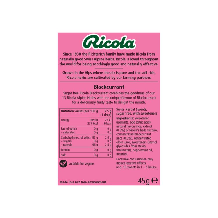 Sweetener (isomalt), acid (citric acid), natural flavourings, extract (0.5%) of Ricola's herb mixture, concentrated blackcurrant juice (0.3%), concentrated elder juice, sweeteners (steviol glycosides from stevia, thaumatin), peppermint oil, menthol. Excessive consumption may induce laxative effects (e.g. 10 sweets in 1 - 2 hours).