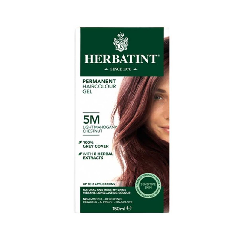 Herbatint permanent herbal hair colour in Light Mahogany Chestnut. Up to two applications per pack. Product has twelve-month shelf life after opening as denoted by jar open symbol on packaging.