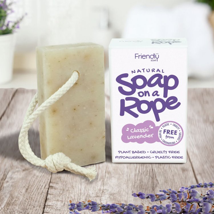 Ingredients: Sodium cocoate, Sodium rapeseedate, Aqua, Sodium shea butterate, Lavandula angustifolia (lavender) oil, Lavandula angustifolia (lavender) flower, Linalool*, *occurs naturally in essential oils. Rope: Cotton. Ethically sourced, natural, undyed and unbleached cotton that is both compostable and biodegradable.