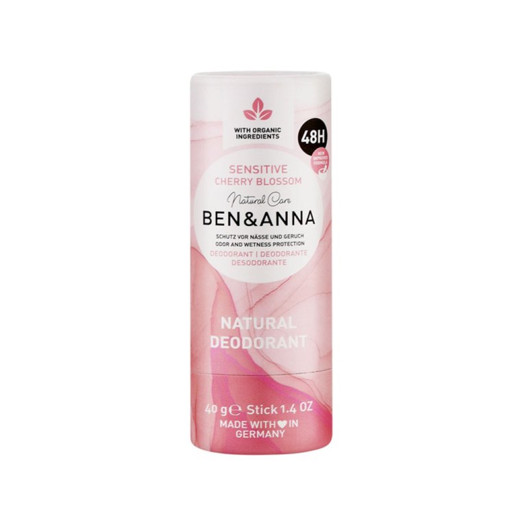Soft, floral and delicately beautiful. Ben and Anna Sensitive Cherry Blossom Deodorant wraps you in the gentle, fleeting fragrance of Japanese cherry blossom from the moment you apply it. Free from bicarbonate of soda and made with naturally derived ingredients, it offers reliable, all-day protection against sweat and odour without any of the sensitivity or irritation that conventional deodorants can bring. Light, feminine and quietly uplifting, it's the kind of scent that feels like a small daily indulgence. Effective, skin-kind and housed in a plastic-free paper tube.