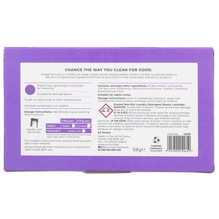 Ecoleaf Concentrated Laundry Sheets are an easy, effective and eco-friendly way to get your laundry clean. Made in the UK from gentle plant-based ingredients, they are tough on stains even at lower temperatures and dissolve completely in both hot and cold water. Perfect for delicates and ideal for travel, these plastic-free sheets are lightweight, mess-free and scented with fresh lavender. Approved by the Vegan Society and certified cruelty free under the Leaping Bunny programme. Safe for use with septic tanks too.