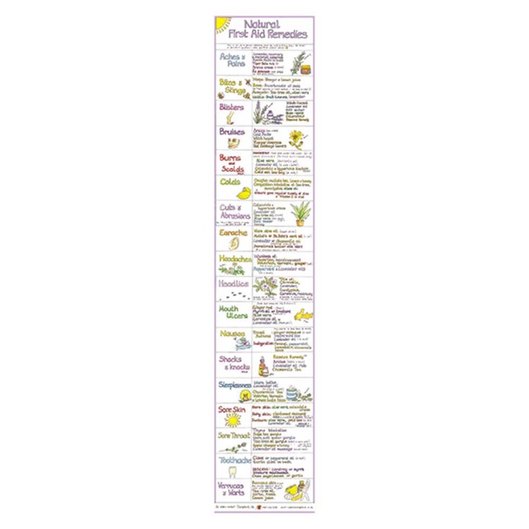 Natural remedies, all in one place. Ever mix up vinegar for wasp stings and bicarb for bee stings? You're not alone. That’s why this beautifully hand-drawn chart brings together tried-and-tested natural remedies for everyday complaints, so you’ve got the answers when you need them. From aches and earaches to stings, headlice, cuts, bruises and beyond, it’s a quick-reference guide to plant-based and traditional treatments. Lavender and tea tree oils get top marks, but there’s a remedy here for almost everything. Printed in full colour on high-quality laminated paper, this chart is easy to read and easy to keep clean. Hang it on the wall and reach for it whenever life throws a bump, bite or sniffle your way. Features remedies for: Aches, pains, bites, stings, blisters, bruises, burns, scalds, colds, cuts, abrasions, earache, headaches, headlice, mouth ulcers, nausea, shocks, knocks, sleeplessness, sore skin, sore throat, verrucas, warts and toothache. Size: 88 × 18cm