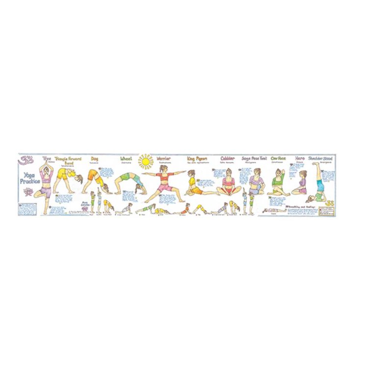 Your daily yoga companion, at a glance. This beautifully illustrated chart is a gentle reminder to stretch, breathe and move with awareness each day. It features a balanced mix of classic yoga poses and breathing exercises to help release tension, build strength and calm the mind. Each pose is clearly drawn with helpful alignment tips and key benefits, making it ideal for beginners and experienced yogis alike. The full Sun Salutation sequence is also included, broken down into easy-to-follow stages. Printed on sturdy laminated paper for daily use at home, in class or at the studio. Poses include: Tree (Vrksasana), Triangle Forward Bend (Parsvottanasana), Downward Dog (Swanasana), Wheel (Chakrasana), Warrior (Virabhadrasana), King Pigeon (Eka Pada Rajakapotasana), Cobbler (Baddha Konasana), Sage Twist (Marichyasana), Cow Face (Gomukhasana), Hero (Virasana), Shoulder Stand (Sarvangasana) Plus: Full Sun Salutation sequence Size: 88 × 18cm