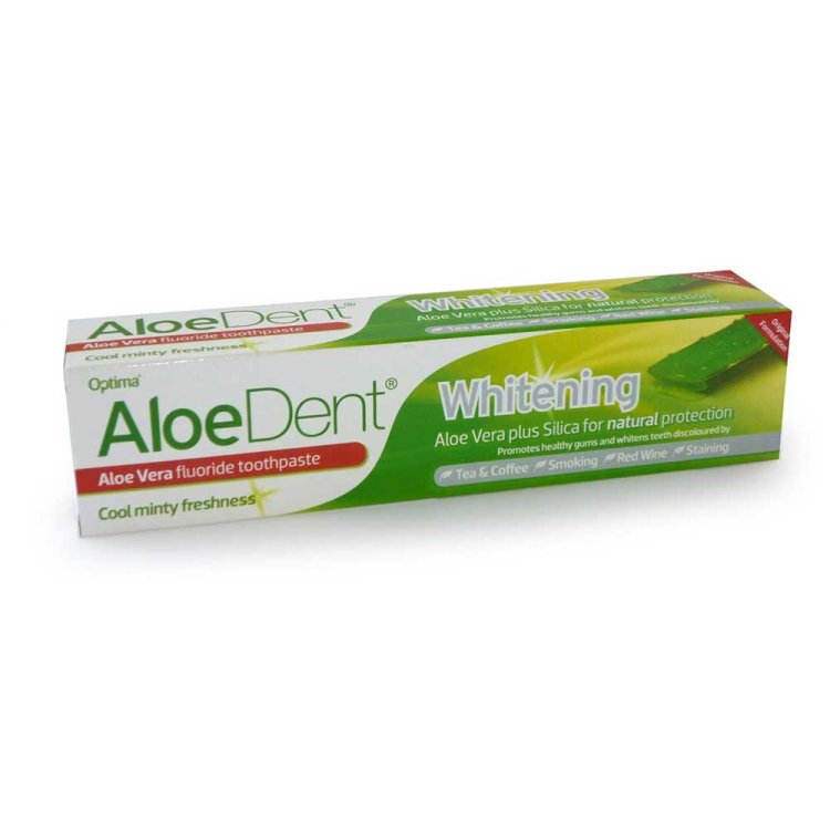 More than just a brush with nature Aloe Dent added some of nature’s most trusted ingredients including soothing Aloe vera and silica which helps keep your teeth naturally white. You can be sure you are getting all the benefits of a fluoride toothpaste, but with natural ingredients, every time you brush: • Aloe Vera – helps soothe gums • Tea Tree Oil – naturally purifying • Silica – for natural whitening • Peppermint & Menthol – natural flavour • Fluoride – anti-cavity Suitable for vegans.