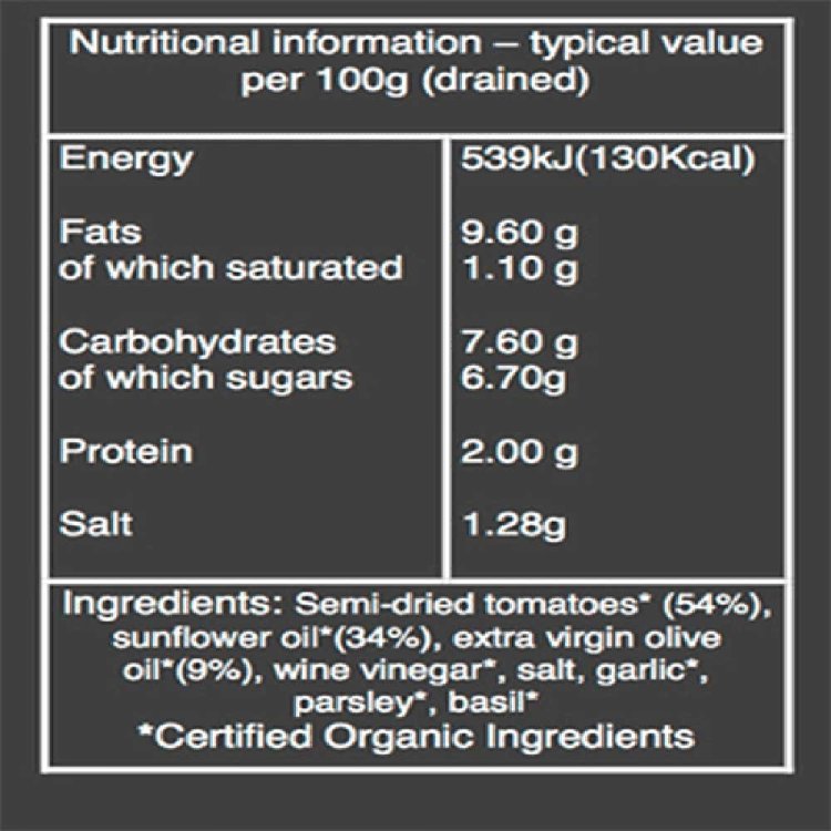 sun-dried tomatoes* (63.01%) sunflower oil *(25.3%), extra virgin olive oil*(6.3%), capers*, wine vinegar*, salt, garlic*, oregano*, parsley*, basil*. * from organic agriculture