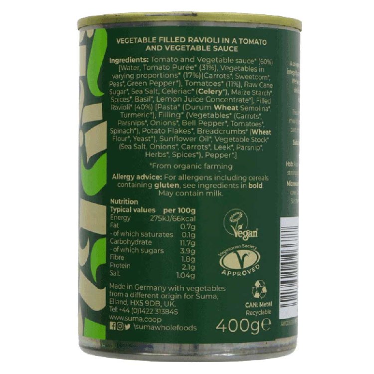 Tomato and vegetable sauce* (60%) [water, tomato puree* (31%), vegetables in varying proportions* (17%)(carrots* , sweetcorn*, peas*, green pepper*), tomatoes* (11%), raw cane sugar*, sea salt, celeriac* (CELERY*), maize starch*, spices*, basil*, lemon juice concentrate*], filled ravioli* (40%) [pasta* (durum WHEAT semolina*(GLUTEN), turmeric*), filling* (vegetables* (carrots*, parsnips*, onions*, bell pepper*, tomatoes*, spinach*), potato flakes*, breadcrumbs* (WHEAT flour*(GLUTEN), yeast*), sunflower oil*, vegetable stock* (sea salt, onions*, carrots*, leek*, parsnip*, herbs*, spices*), pepper*.] *from organic farming