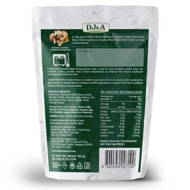 DJ&A’s Mixed Mushroom Crisps are made from a blend of shiitake, oyster, and nameko mushrooms, offering a rich, umami-packed flavour that’s both bold and satisfying. These all-natural, plant-based crisps are a healthier alternative to traditional snacks, lower in fat and high in fibre to keep you full longer. Plus, they’re ready to eat wherever you are.