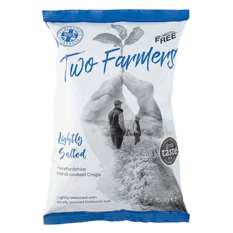 Made from award-winning potatoes grown on their farm in Herefordshire, these crisps are hand-cooked in small batches for that perfect, crunchy bite. Seasoned with hand-harvested Droitwich Salt, these crisps offer a subtle, satisfying taste that’s not too overpowering. The salt is crystallised using renewable energy, reflecting Two Farmers' commitment to sustainability. And with 100% compostable packaging, these crisps are kind to the planet too, breaking down in home composting environments in just 26 weeks. The ingredients are simple and locally sourced, with potatoes from their own farm and a touch of rosemary extract for that extra crunch. Suitable for both vegans and gluten-free diets, these crisps are a snack you can feel good about. Whether you’re relaxing at home or sharing with friends, Two Farmers Lightly Salted Crisps bring a taste of Herefordshire right to your snack time.