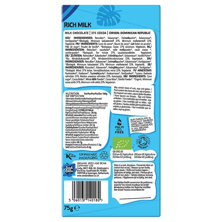 Organic Rich Milk Chocolate Bar Seed & Bean 75g