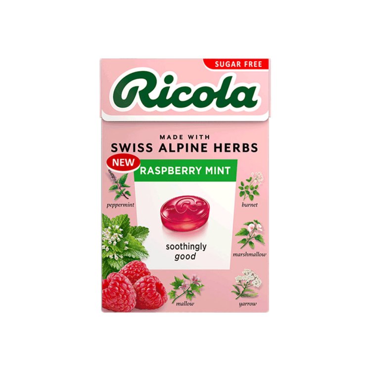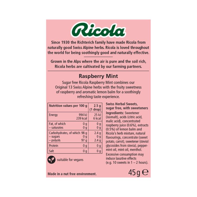Sweetener (isomalt), acids (citric acid, malic acid), concentrated raspberry juice (0.6%), extracts (0.5%) of lemon balm and Ricola’s herb mixture, natural flavourings, concentrate (sweet potato, carrot), sweetener (steviol glycosides from stevia), peppermint oil, mint oil, menthol.