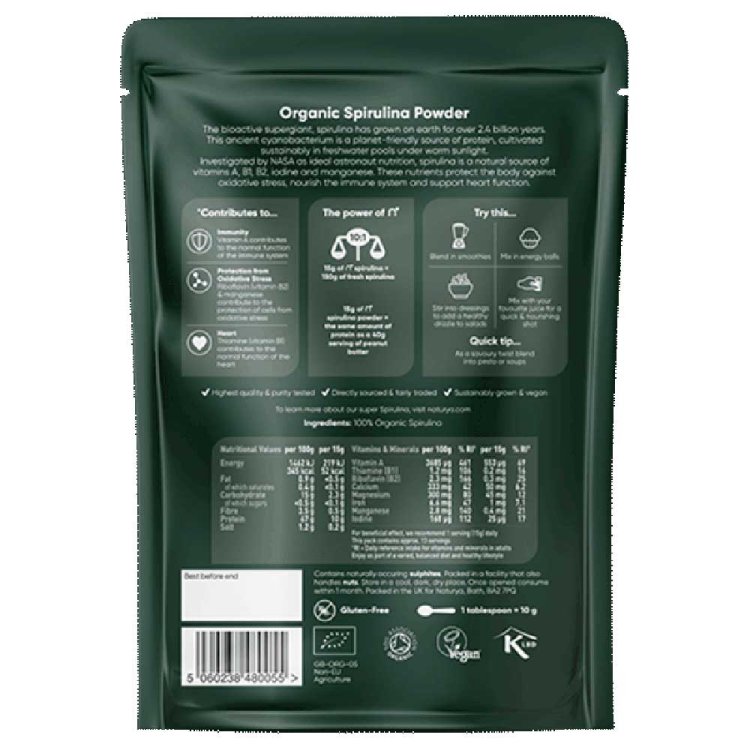 Spirulina has inhabited the world for over 2.4 billion years. Rich in protein. Helps to build muscle mass and support immunity. Organic, gluten-free, kosher and vegan Allergens: contains naturally occurring Sulphites.